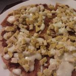 9. Once the cheese is melted you can eat as is or top with anything desired as noted even sauteed mushrooms there literally is no set list of toppings  *showing secondary option using ground meat and three cheese for the main dish vs appetizer. When using as an app you can apply same amount or less of each topping and slice into four pieces.  When having as a main dish I cut with a fork and knife